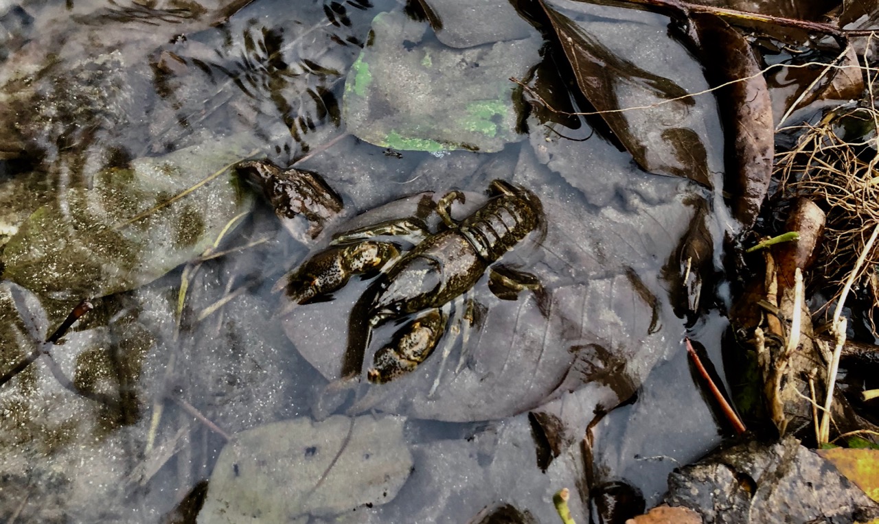 Walking along the dirt paths there’s the familiar scurrying of lizards, darting to shelter through the crisp dry leaves. Scores of bright frogs jump back into the steam on my approach. The air is thick with dragonflies. A three or more foot long snake kindly slivered off the path avoiding the need for confrontation. Grasshoppers take flight on blackcurrant and apricot coloured wings. Huge grasshoppers (definitely not crickets) fly greater distances with a sawing noise from their wings. Crayfish – I read of people catching crayfish but I’d never seen them wild until today. A busking cicada popped into the van hoping to play his maracas, but it was a bit loud for our tastes so we asked him to leave.
