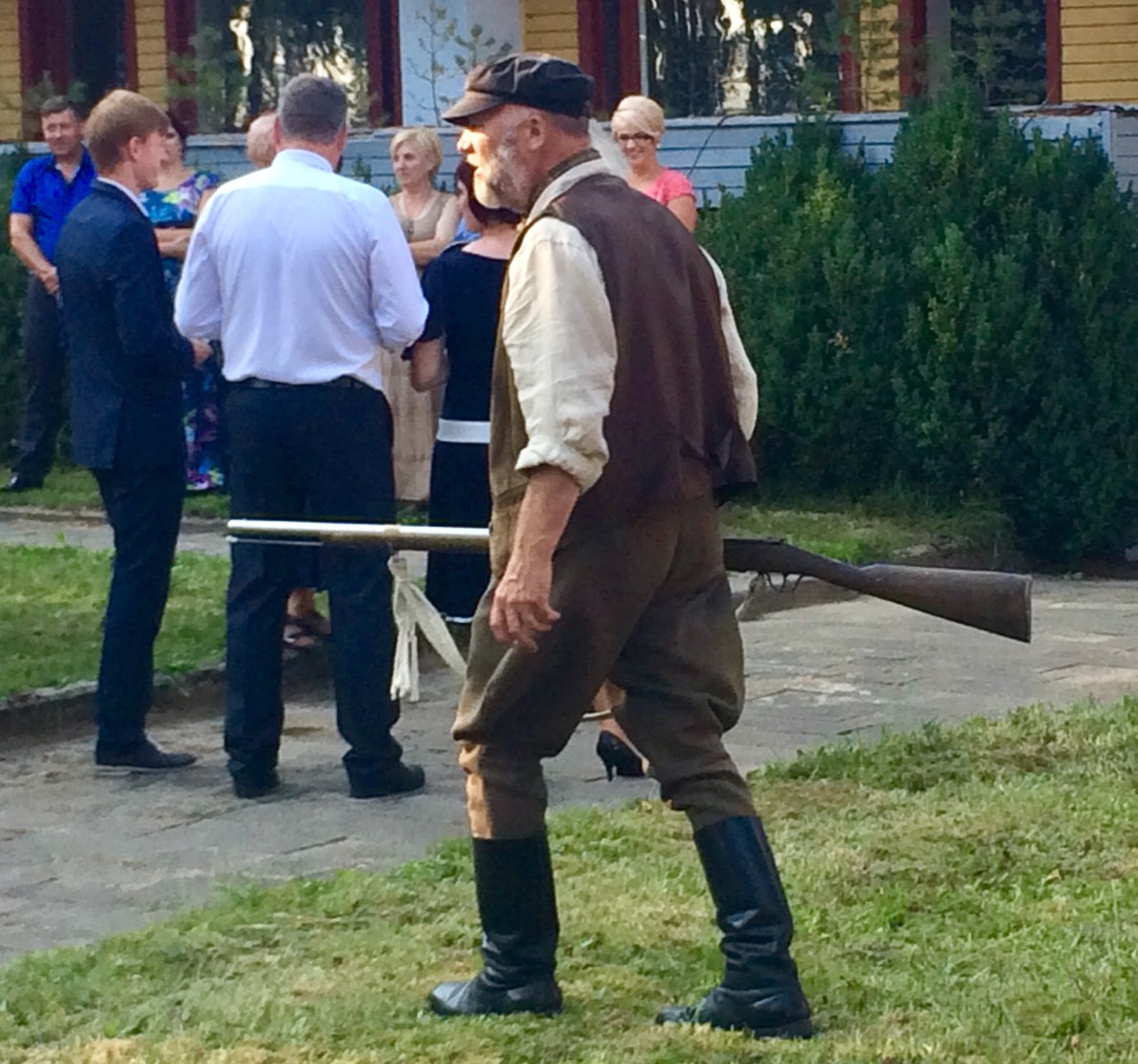 The wedding couple were greeted by two old fellows in traditional costume bearing muskets that they enjoyed firing with deafening bangs. The two old boys then plied the guests, and us, with home made vodka that our new mates assured us was around 65% proof.