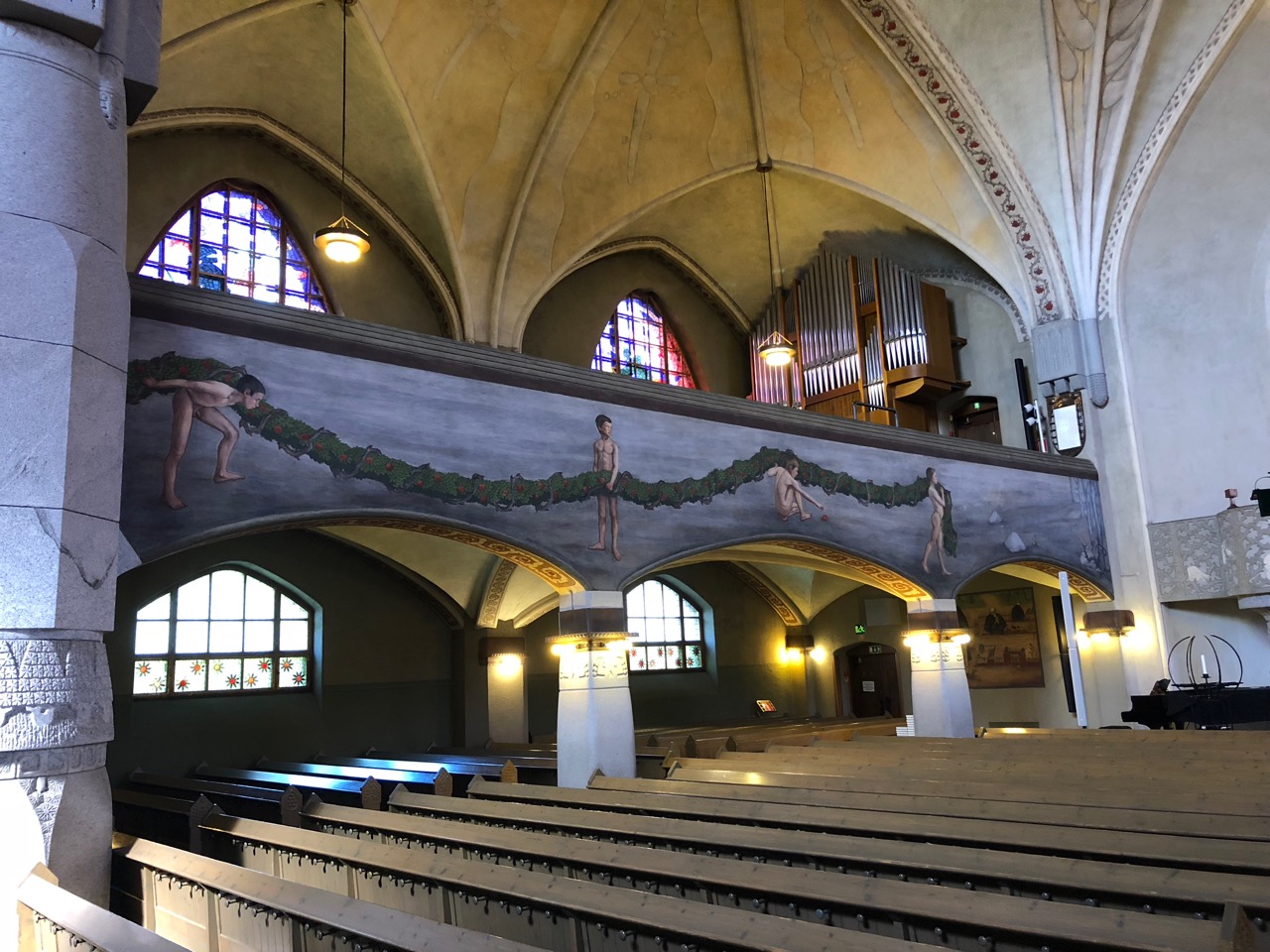 Tuomiokirkko was built in 1907 in what’s called the National Romantic style. It was a difficult time in Finland’s history, and the depiction of the artwork in the church is both brave and hunting. Twelve childlike ghost apostles carry a clearly ailing tree of life. An angel is stretchered off from the resurrection, the colours are mournful lilacs. Even the stonework is disturbing.