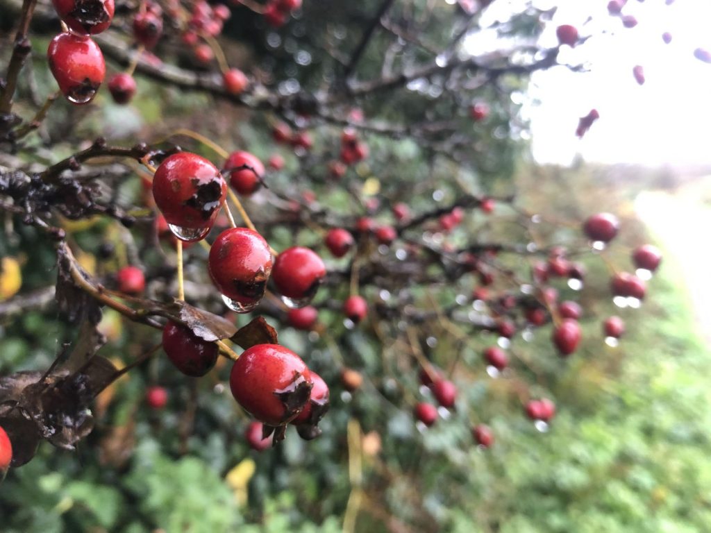 For now my best days are the ones when I rise early and walk Polly through the unfolding dawn. The reds of the bracken strong against the fresh greens of well watered fields. Leaves holding on in the valleys, while on the tops they’re long gone.