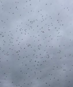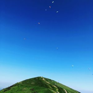 Flat plains (is that tautologous?) stretch for miles, interrupted only by the Malvern Hills. We climb the Beacon to watch the paragliders swirl, and look towards where we know Wales lurks in the haze.